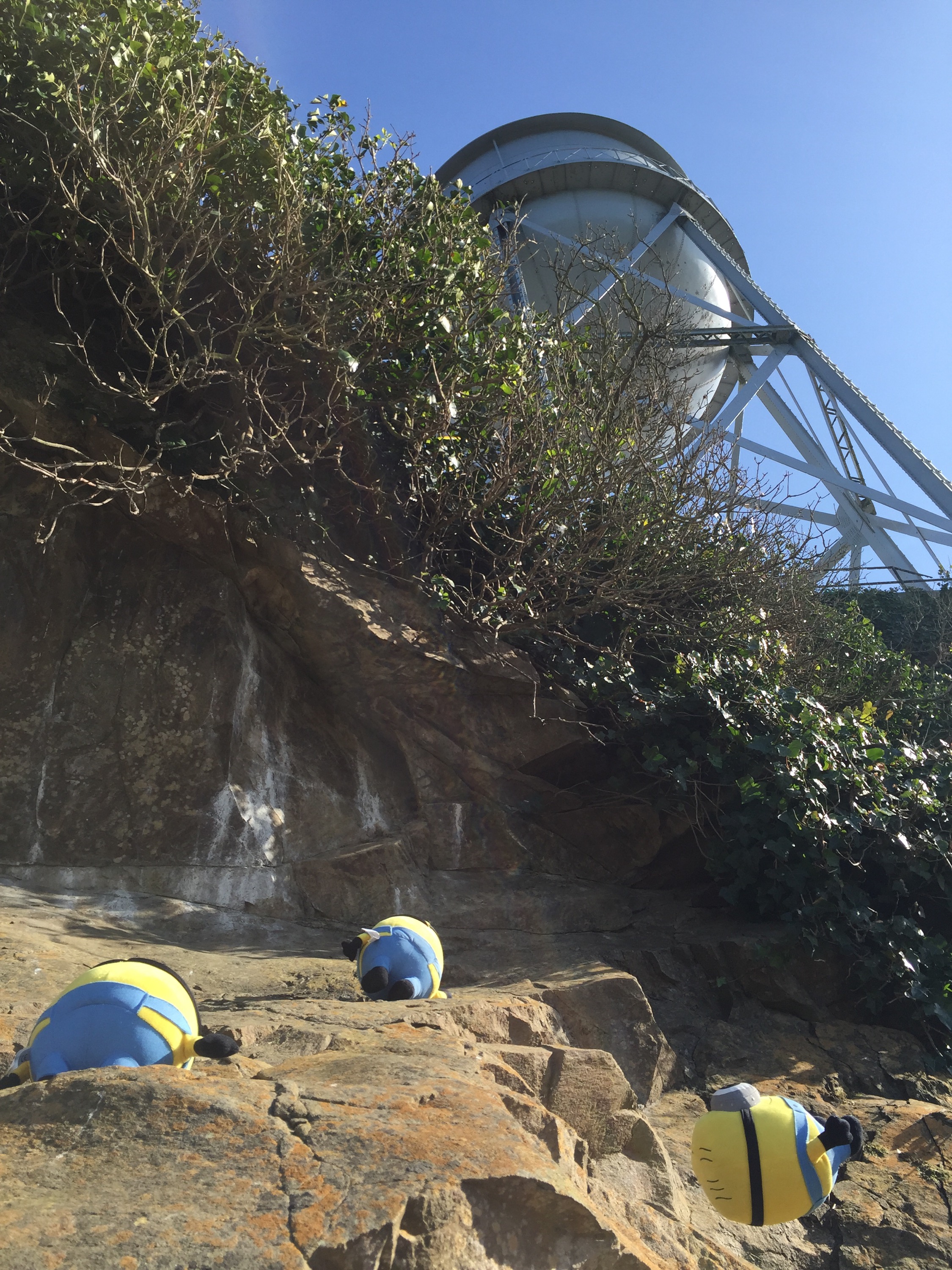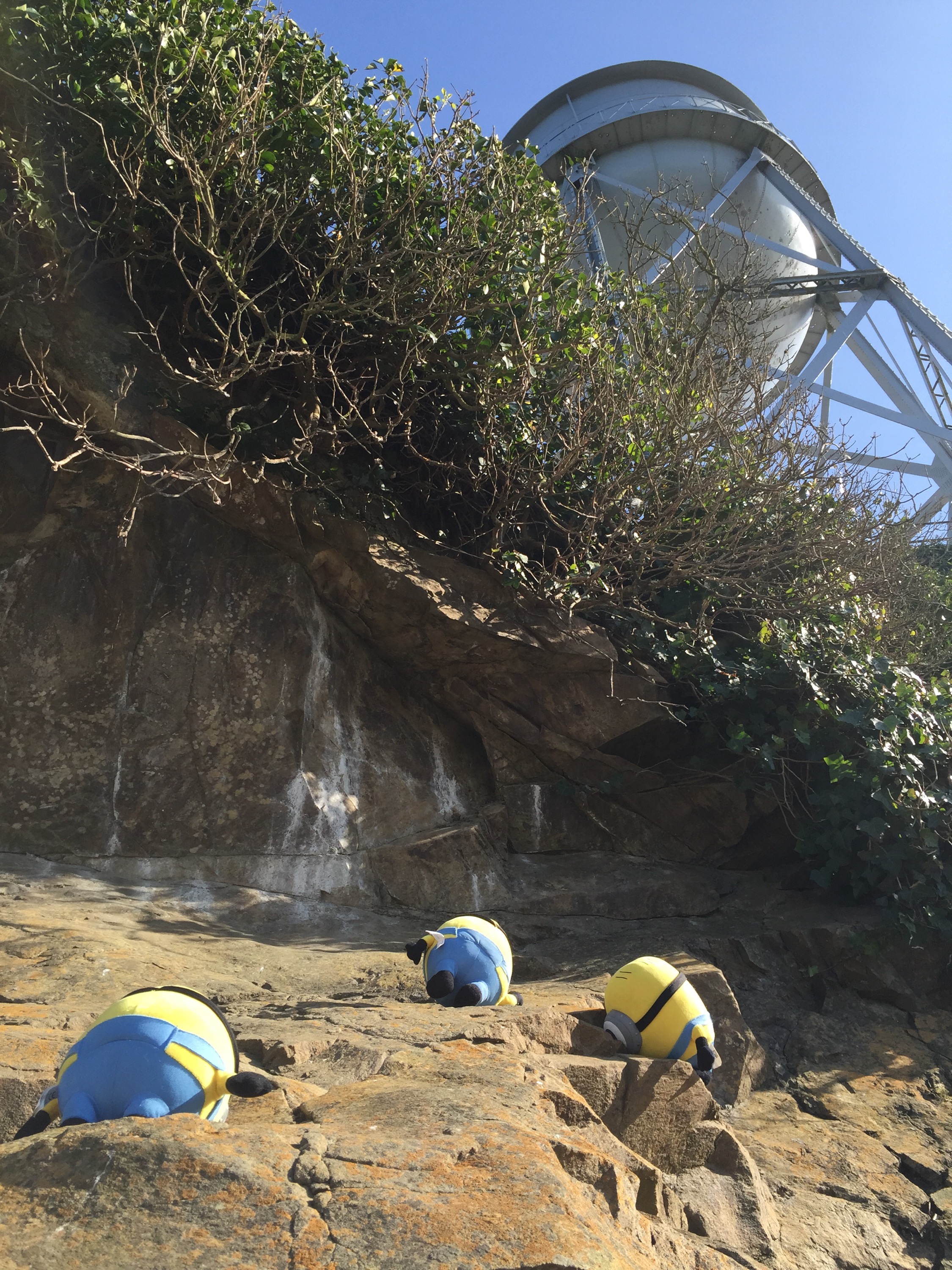 Scrambling down the cliff by the water tower. Hold on tight Stuart!